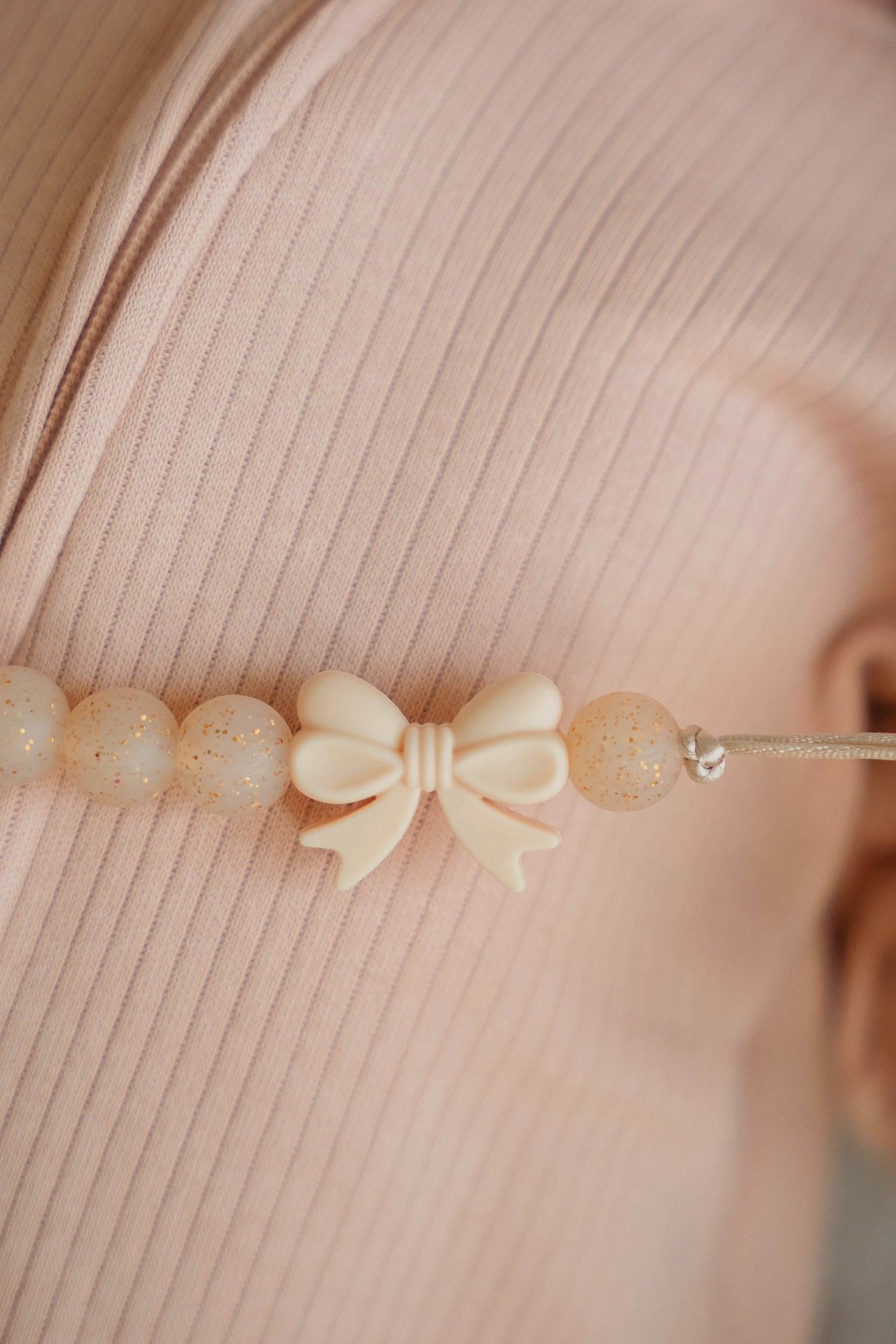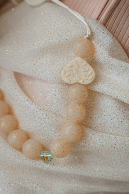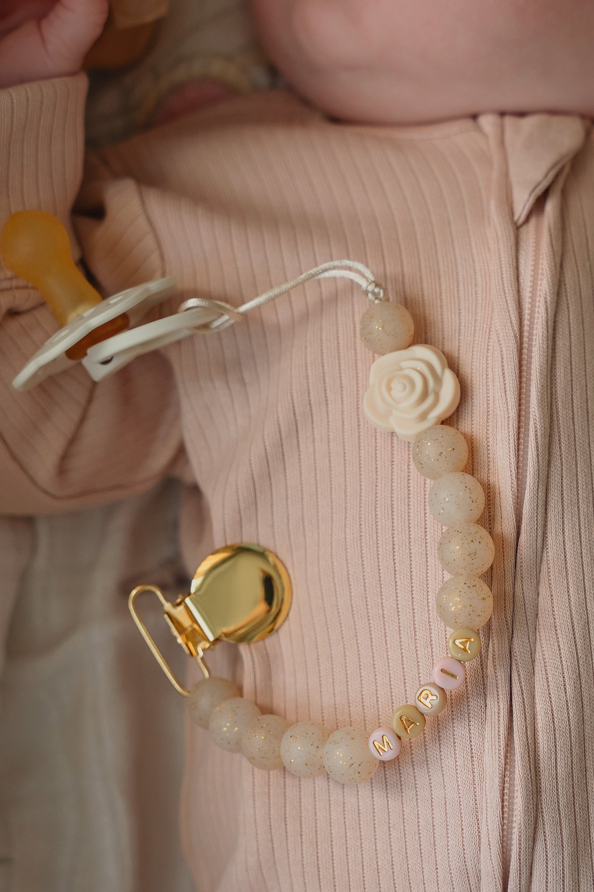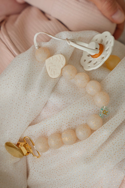 Lănțișorul „Made with Heart” este mai mult decât un simplu accesoriu care ține suzeta, este mica bijuterie delicată a bebelușului tău, care adaugă un strop de farmec oricărei ținute!