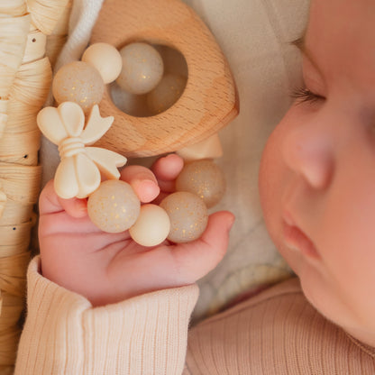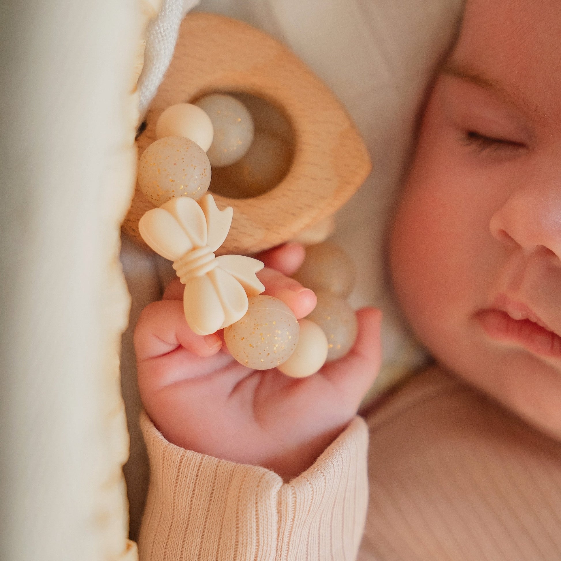 Jucăria de dentiție Bunnylicious, o piesă cu adevărat specială, realizată din lemn organic netratat și aceleași mărgele siliconice, este jucăria perfectă pentru mânuțele curioase și gingiile sensibile ale celor mici. Lucrată manual pentru un design original, se face iubita din prima clipă atât de bebeluși cât și de mămici.