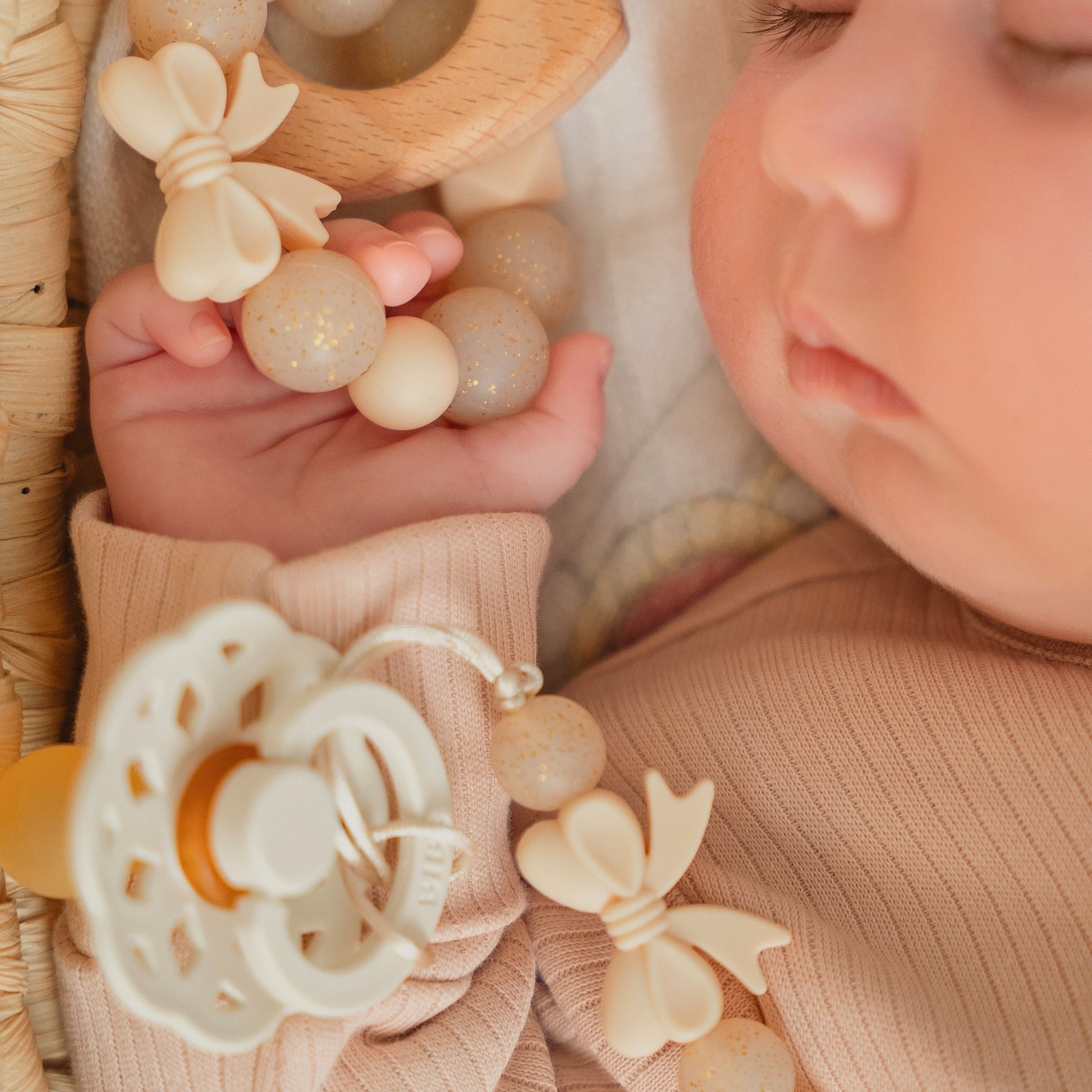 Lănțișor de suzetă realizat din mărgele moi din 100% silicon alimentar, nontoxice, hipoalergenice și complet sigure – fără BPA, BPS, PVC, ftalați, plumb sau cadmiu. Jucărie de dentiție din lemn organic netratat și aceleași mărgele siliconice.