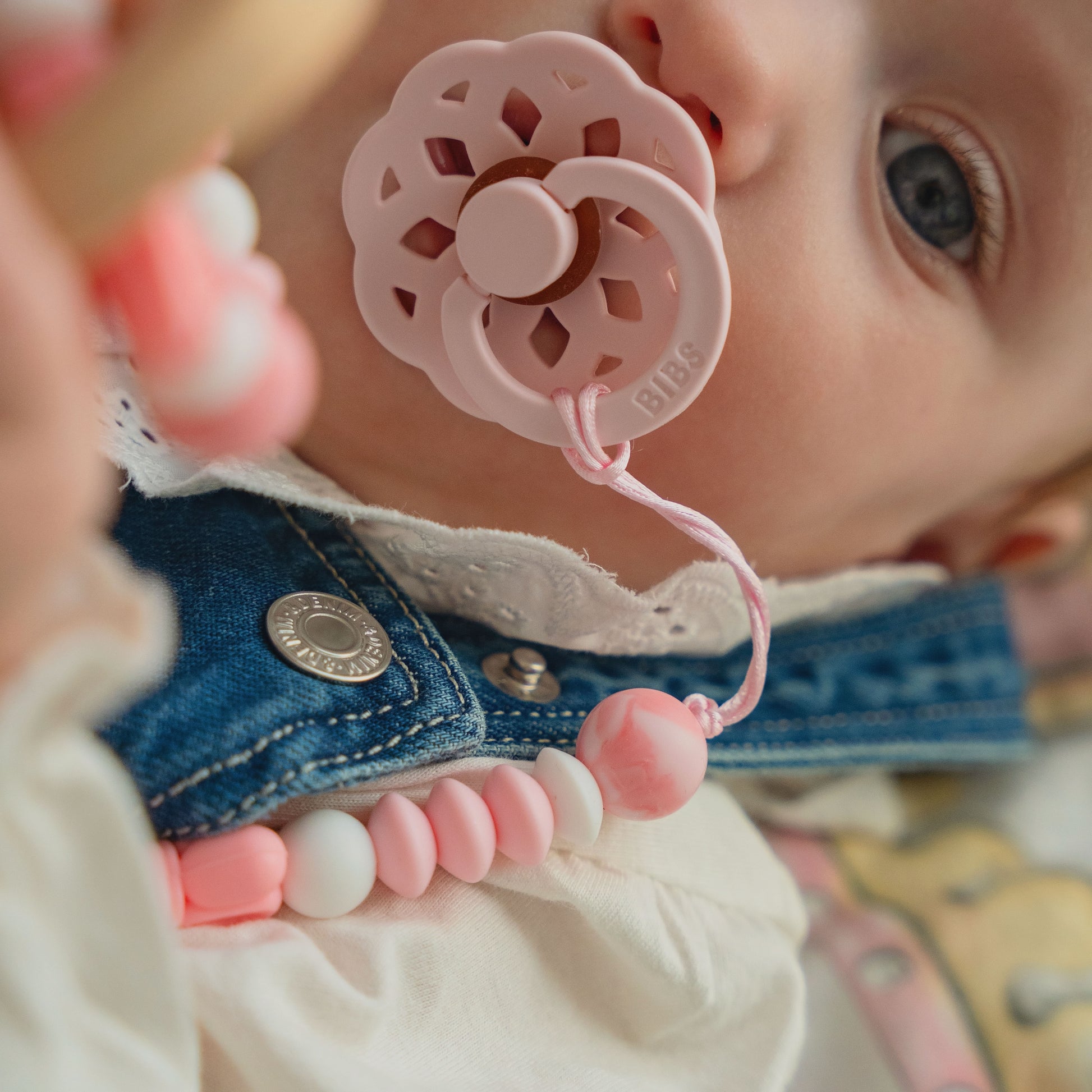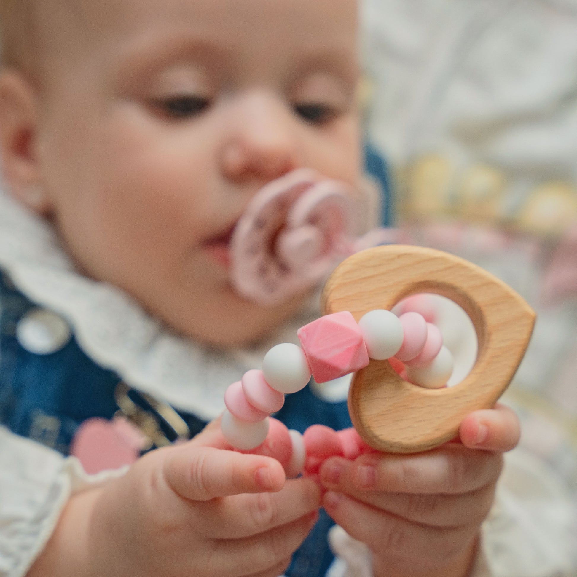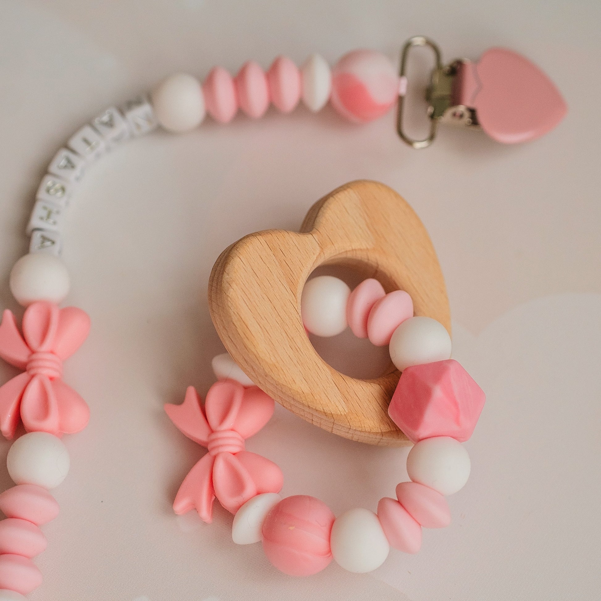 Lănțișor de suzetă realizat din mărgele moi din 100% silicon alimentar, nontoxice, hipoalergenice și complet sigure – fără BPA, BPS, PVC, ftalați, plumb sau cadmiu. Jucărie de dentiție din lemn organic netratat și aceleași mărgele siliconice.