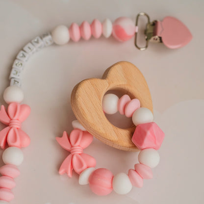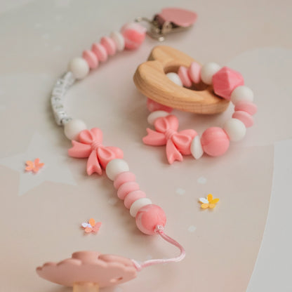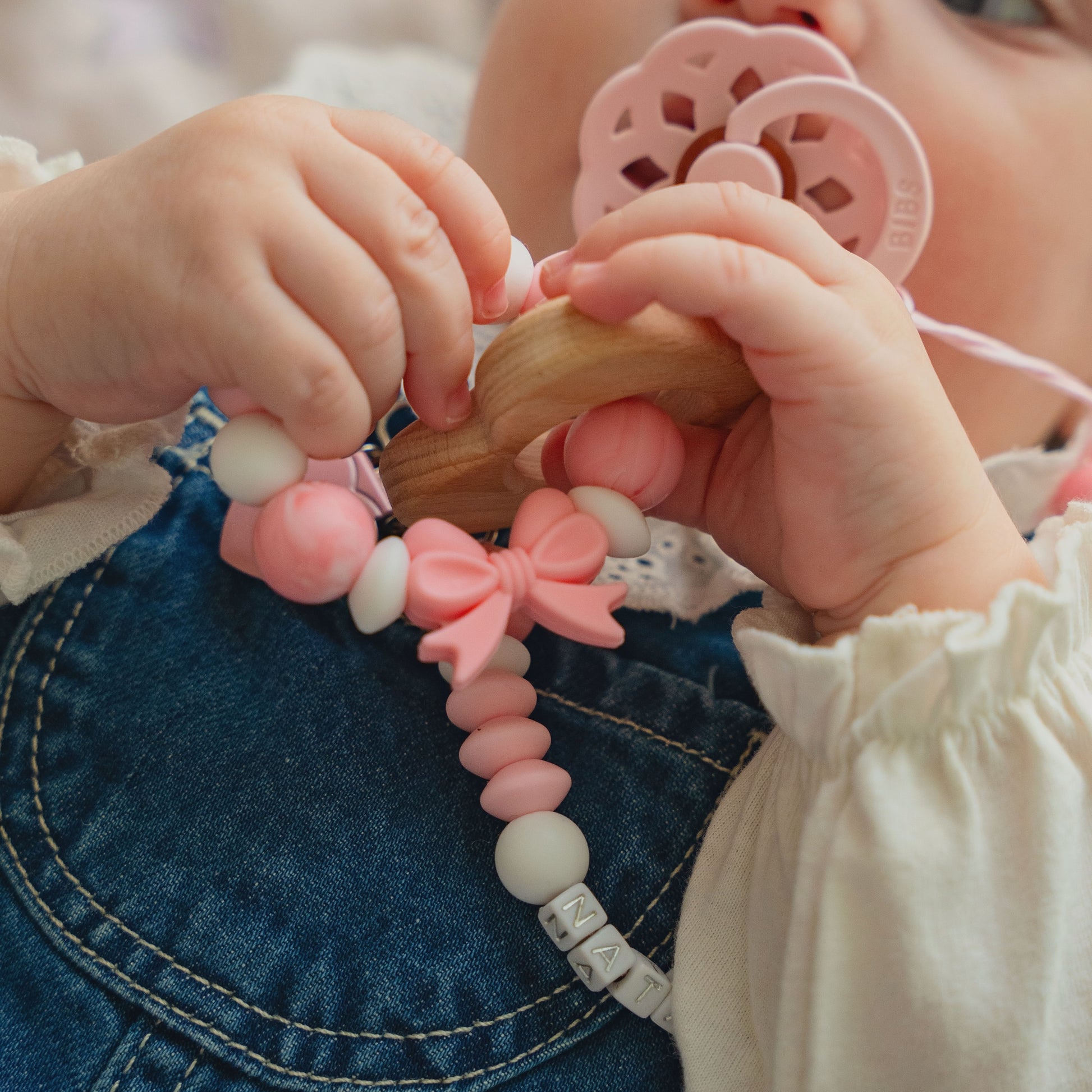 Dacă ești în căutarea unui cadou personalizat pentru baby shower sau pentru un nou-născut, îți propunem acest set “Bowtiful”. Format din lănțișor de suzeta și jucărie de dentiție, e gata să aducă zâmbete mici și bucurii mari. Personalizat cu numele bebelușului, devine un cadou cu adevărat special și memorabil.